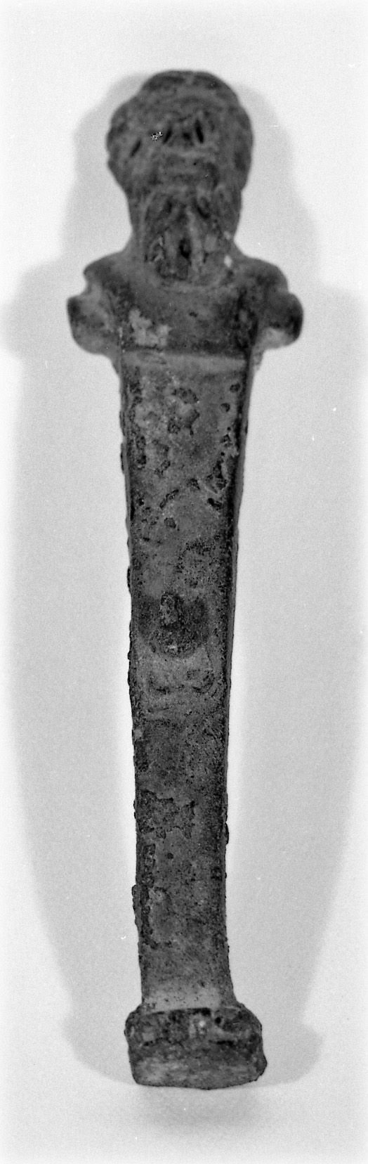 Figura di erma miniaturistica. La testa maschile presenta capelli ricci raccolti dietro, con scriminatura centrale e ciocche frontali. Il volto è stilizzato e l figura porta una lunga barba riccia. Il mezzobusto mostra due abbozzi di braccia ai lati. Il pilastro quadrangolare è liscio e reca in evidenza i genitali maschili. Il pilastro termina in una piccola base squadrata. L'oggetto è realizzato con la tecnica della cera persa per la fusione piena.