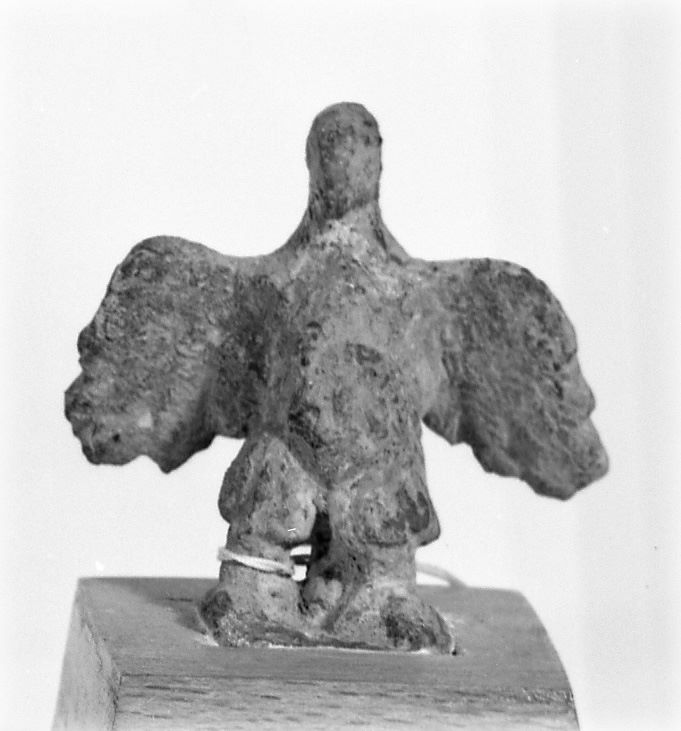 Figura di aquila ad ali spiegate. La testa, di piccole dimensioni e stilizzata, presenta soltanto il becco riconoscibile. La figura poggia su una piccola base in bronzo ed è montata su una moderna base in legno. L'oggetto è realizzato con la tecnica della cera persa per la fusione piena.