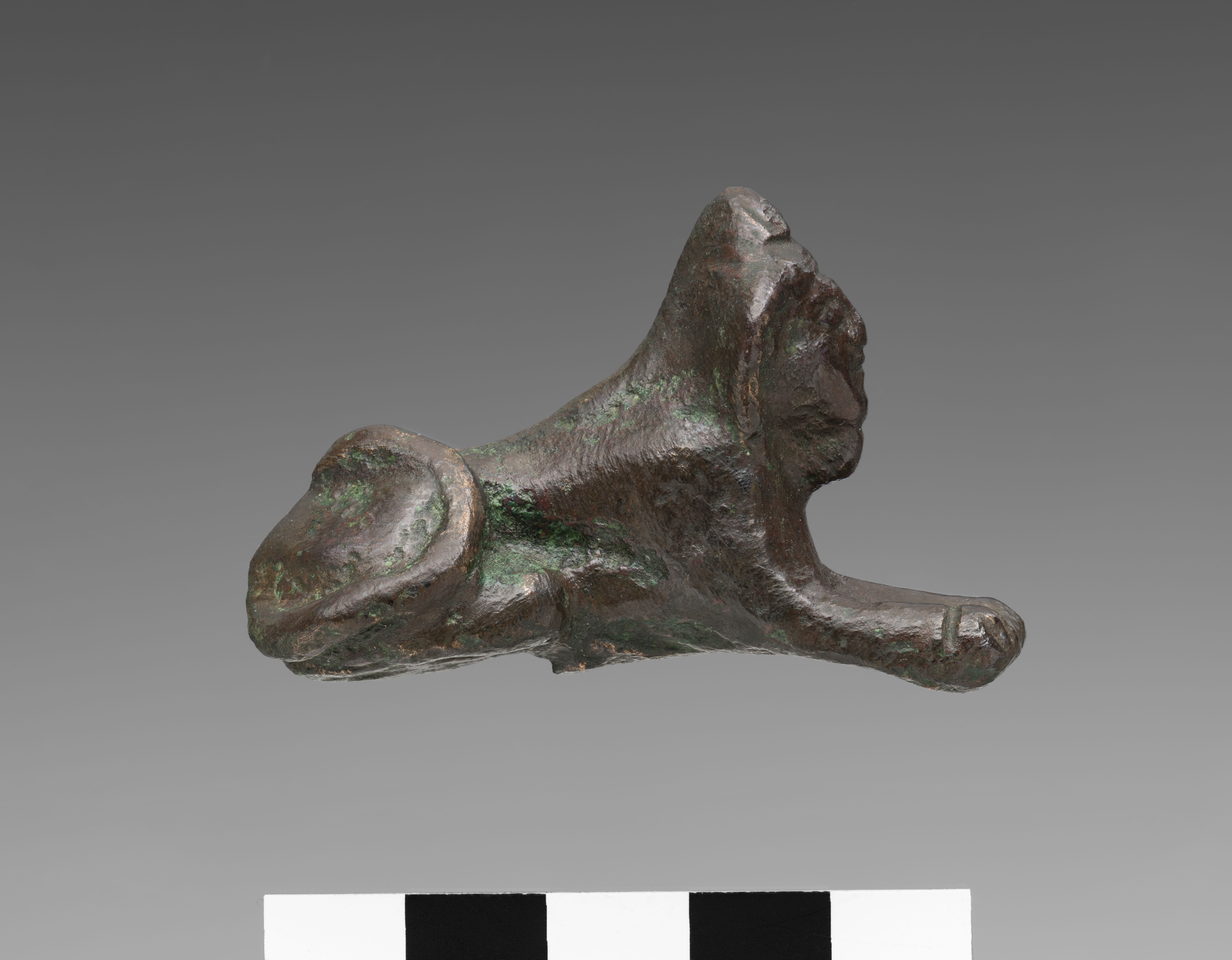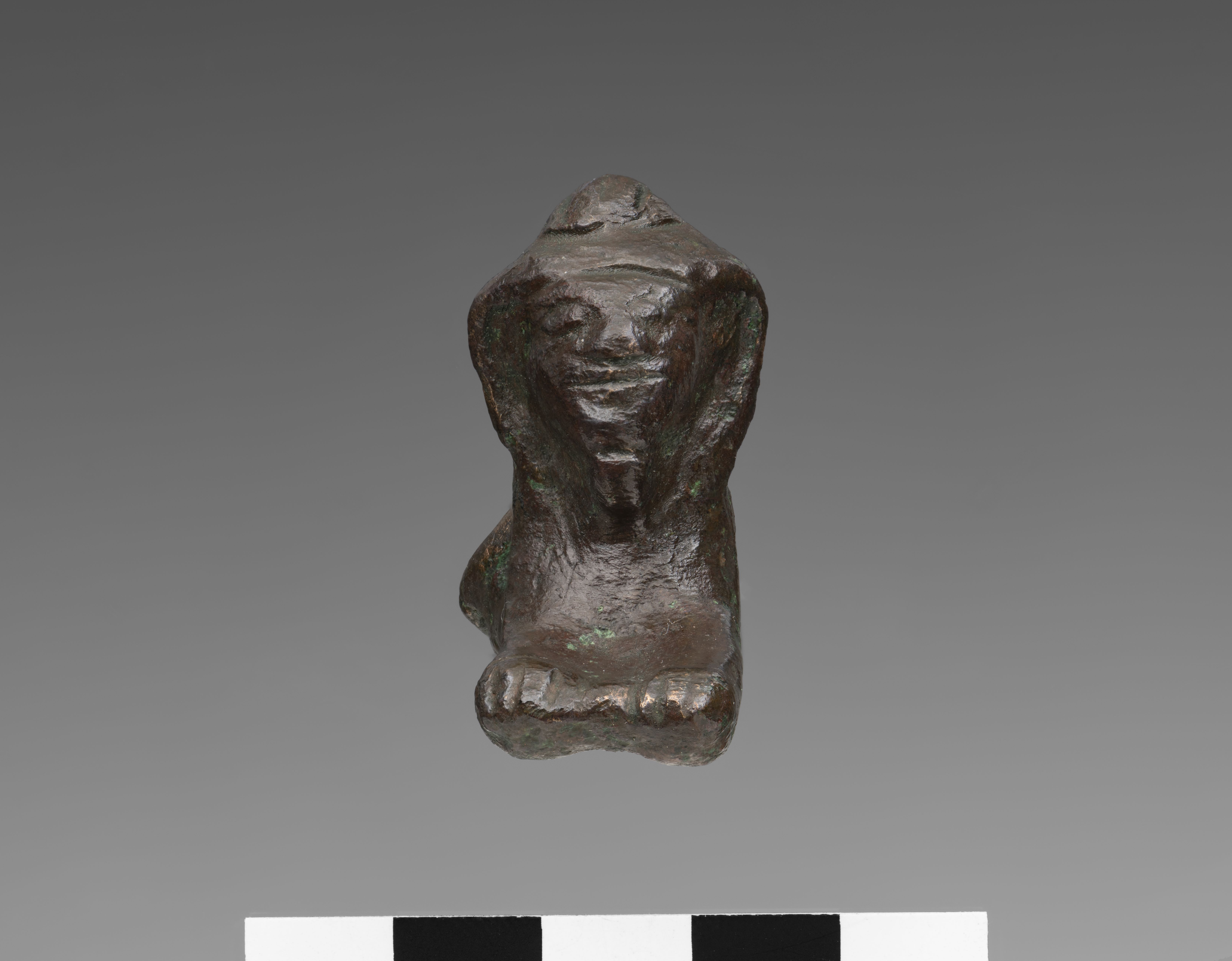 Figura di sfinge accovacciata. Sul capo sembra indossare un nemes con ureo, resi in modo stilizzato. Il volto umano è schematico e porta una barba posticcia. Le zampe anteriori sono unite, la coda si arrotola lungo la coscia destra. Un tenone a sezione rettangolare sporge da sotto la base. L'oggetto è realizzato con la tecnica della cera persa per la fusione piena.