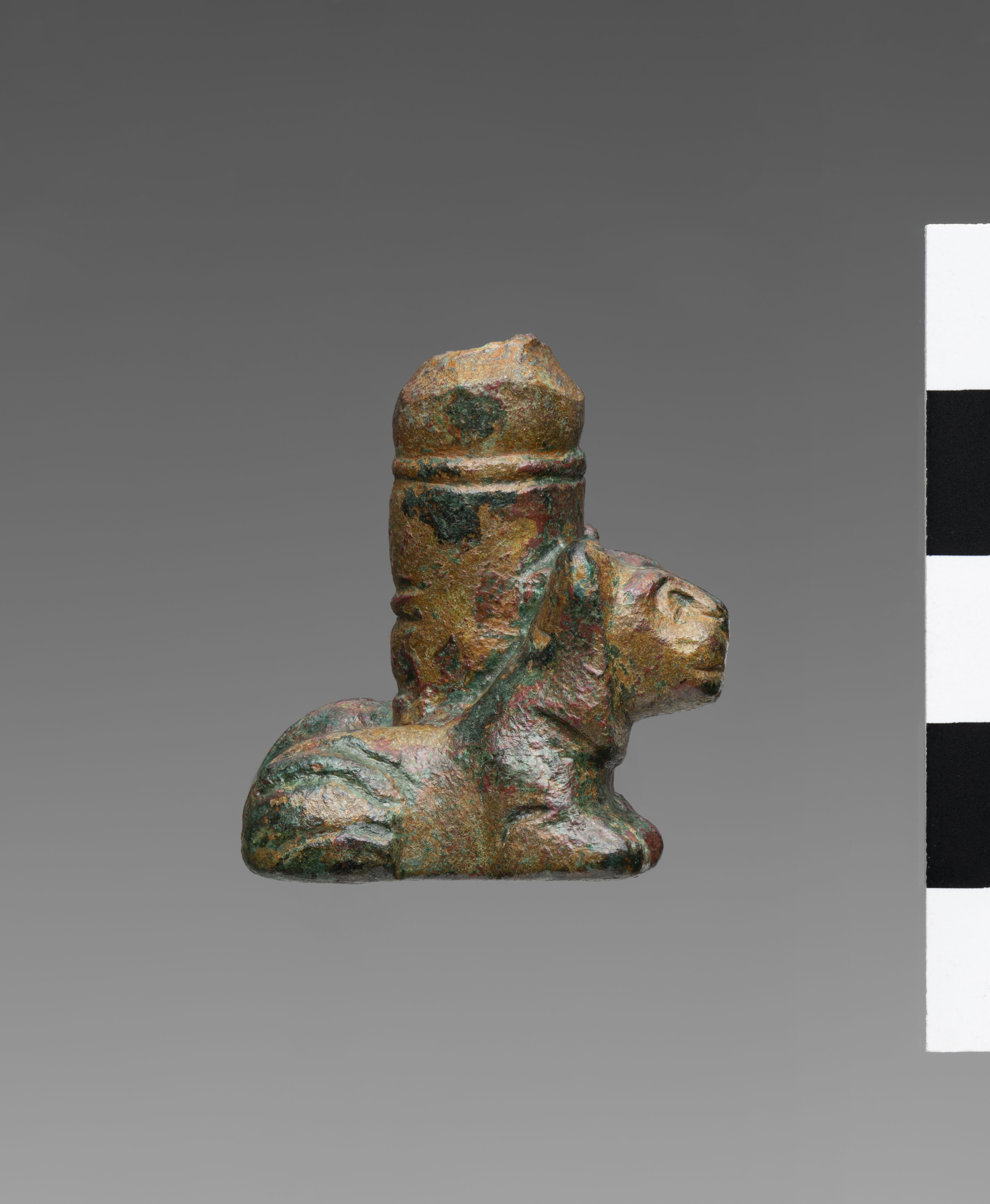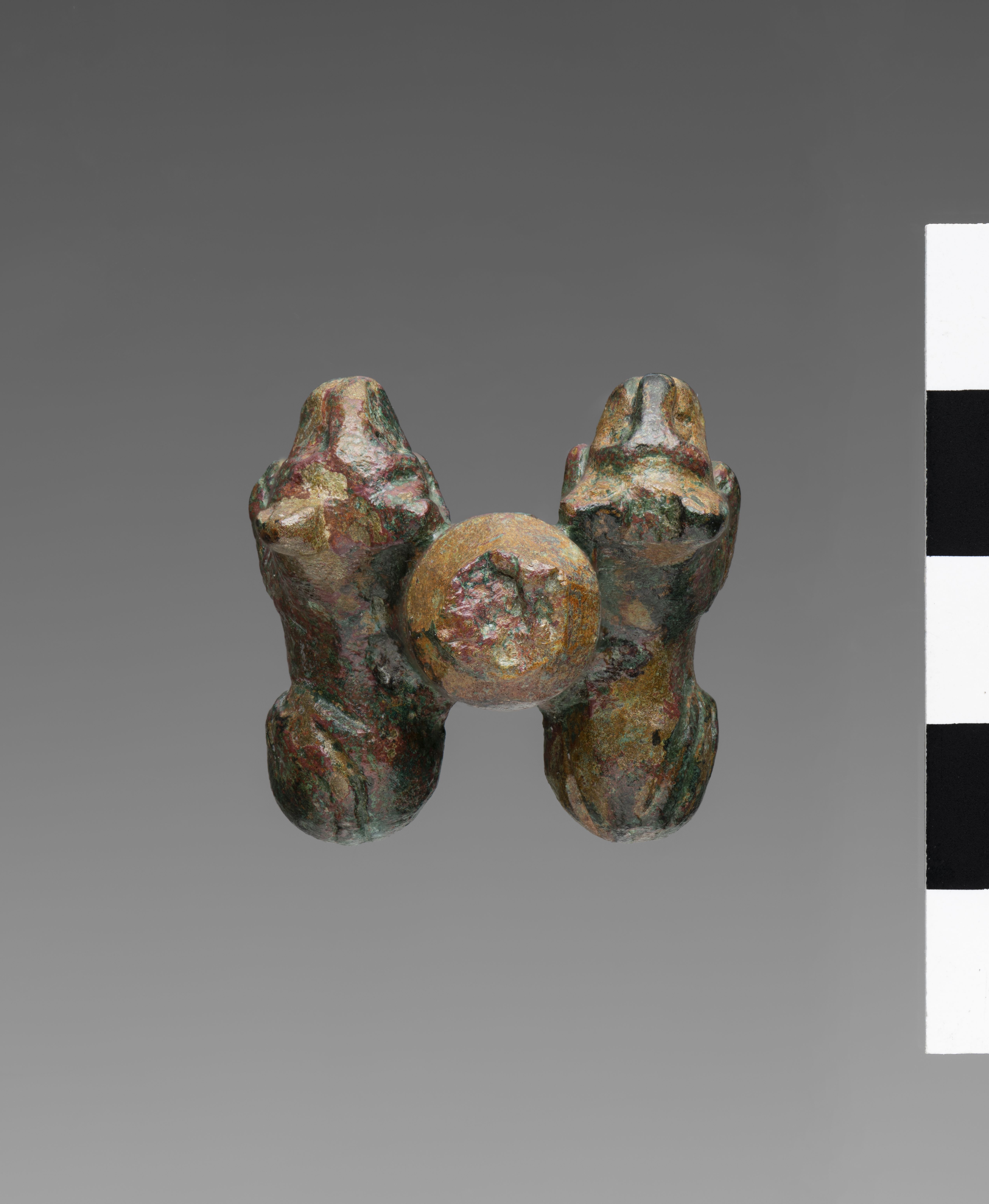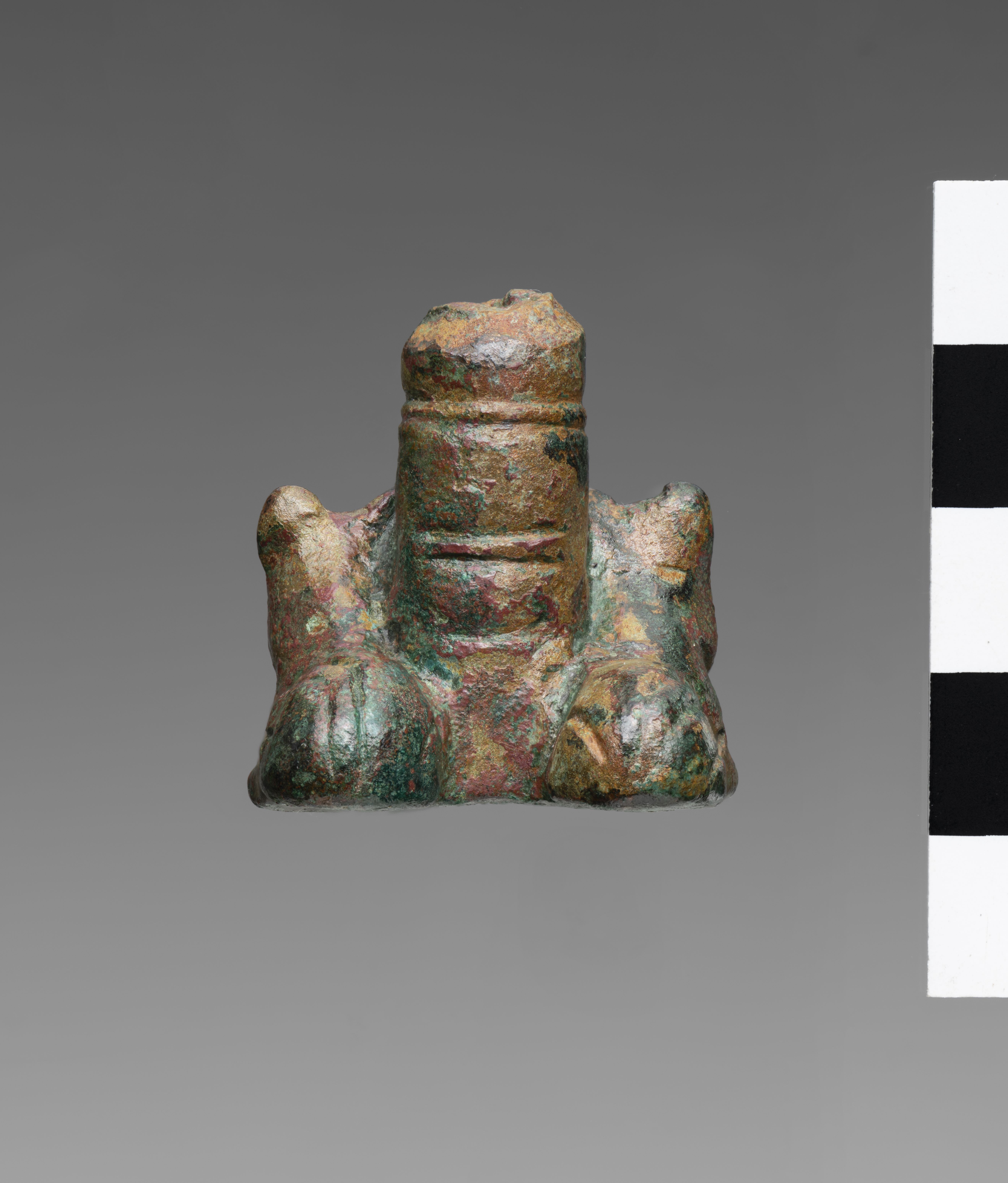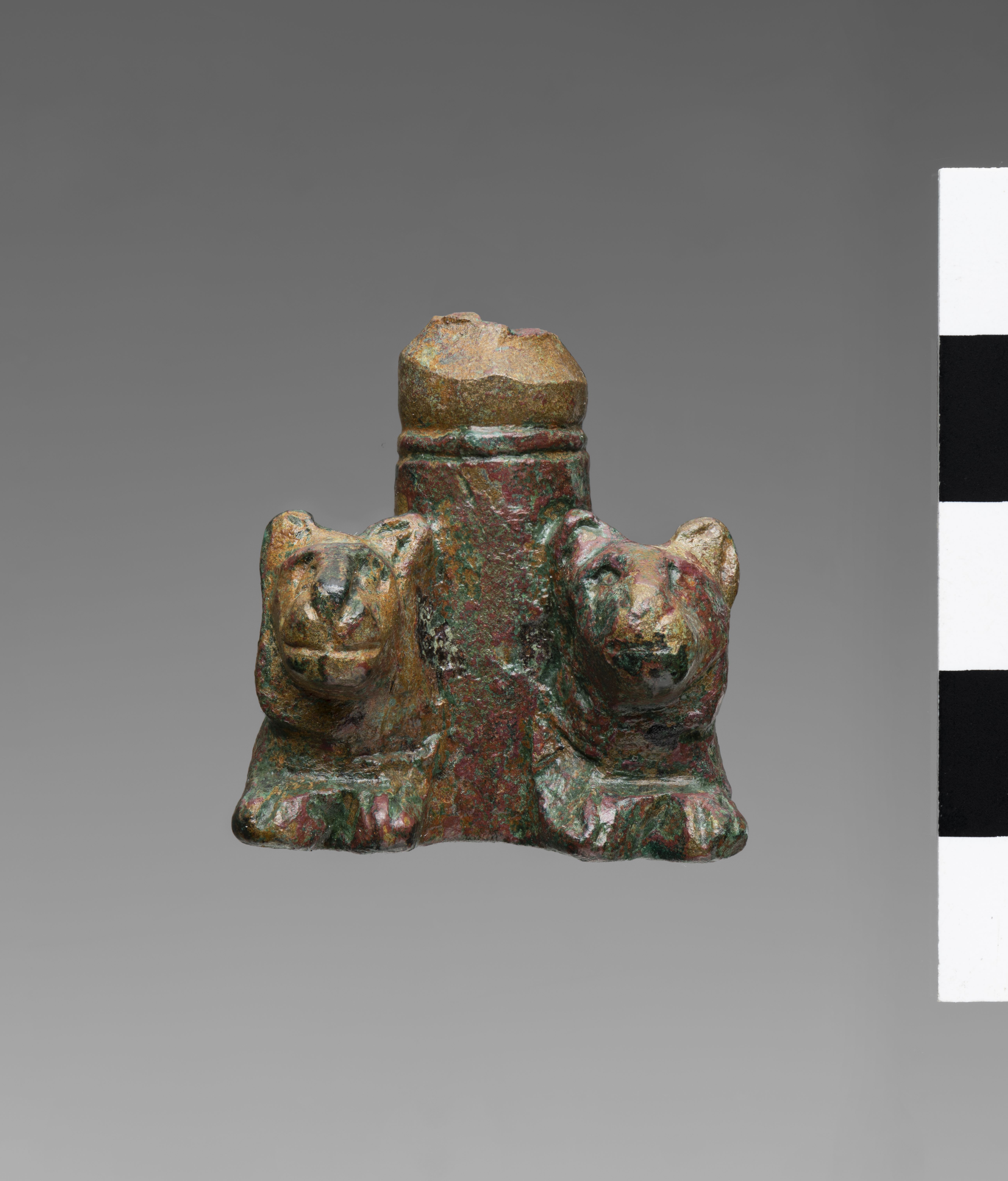Frammento di manico di sistro ad arco. Il frammento corrisponde alla base, affiancata da due leoni recumbenti e stilizzati, le code che si avvolgono sulle cosce esterne. L'oggetto è realizzato con la tecnica della cera persa per la fusione piena.