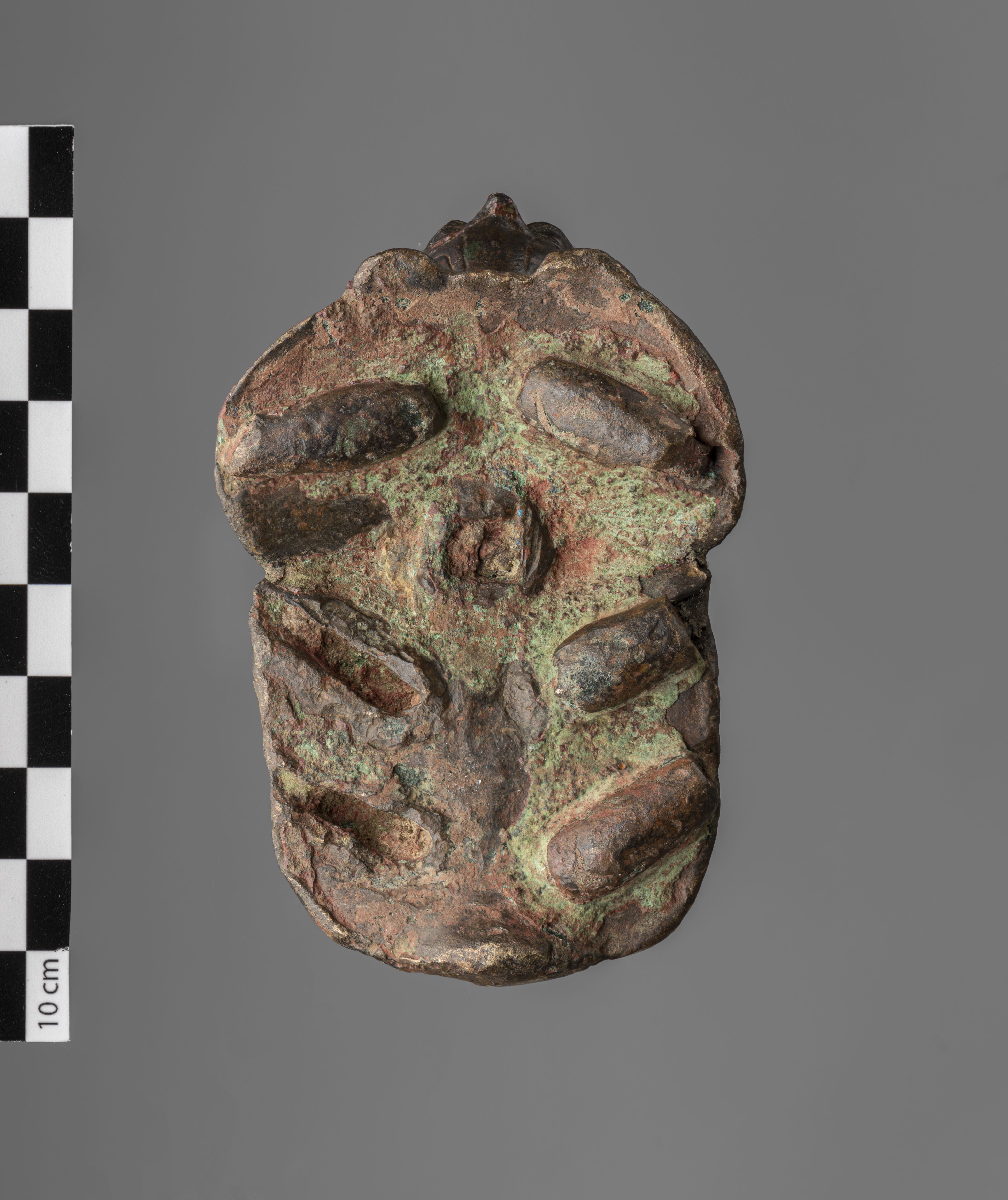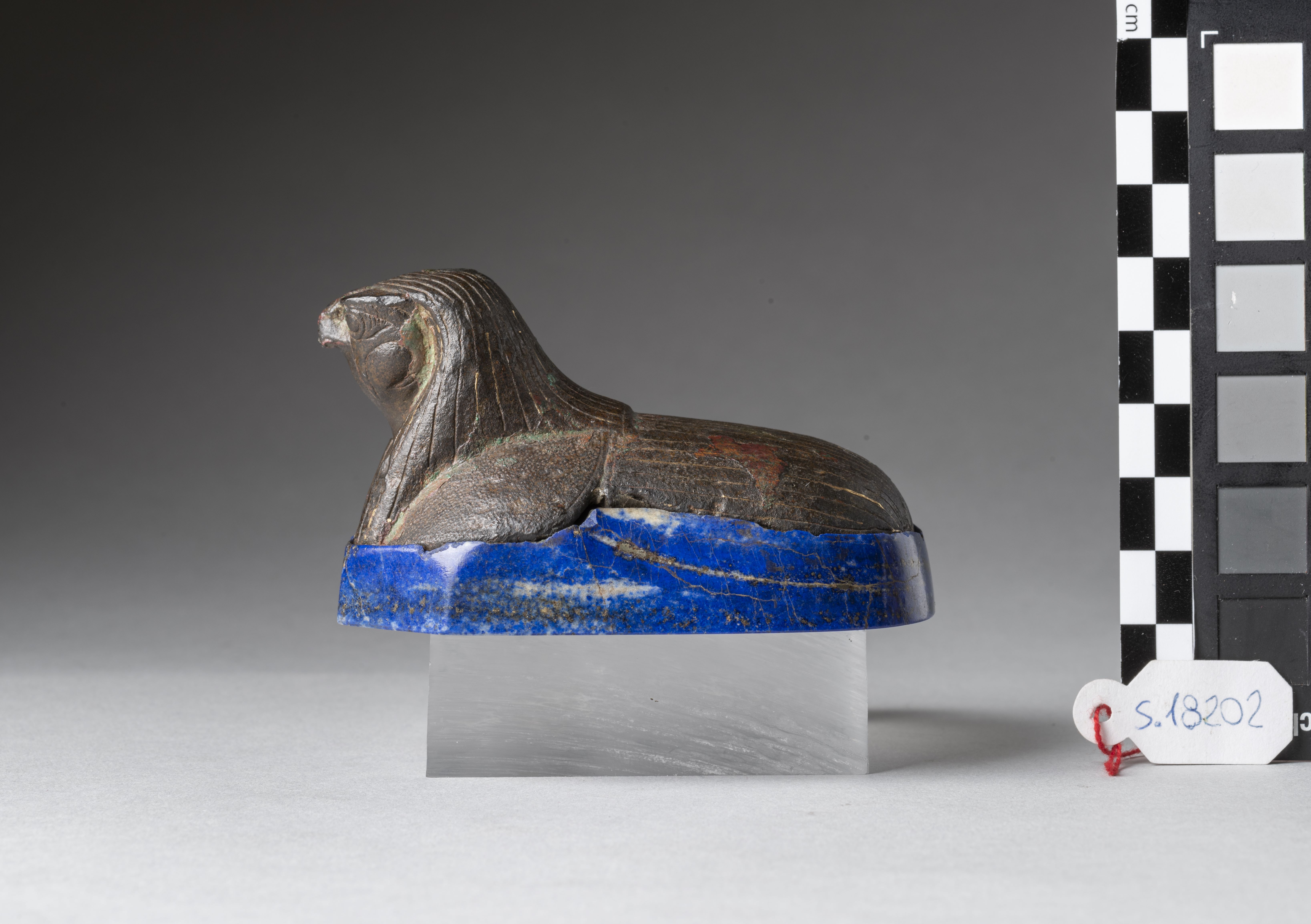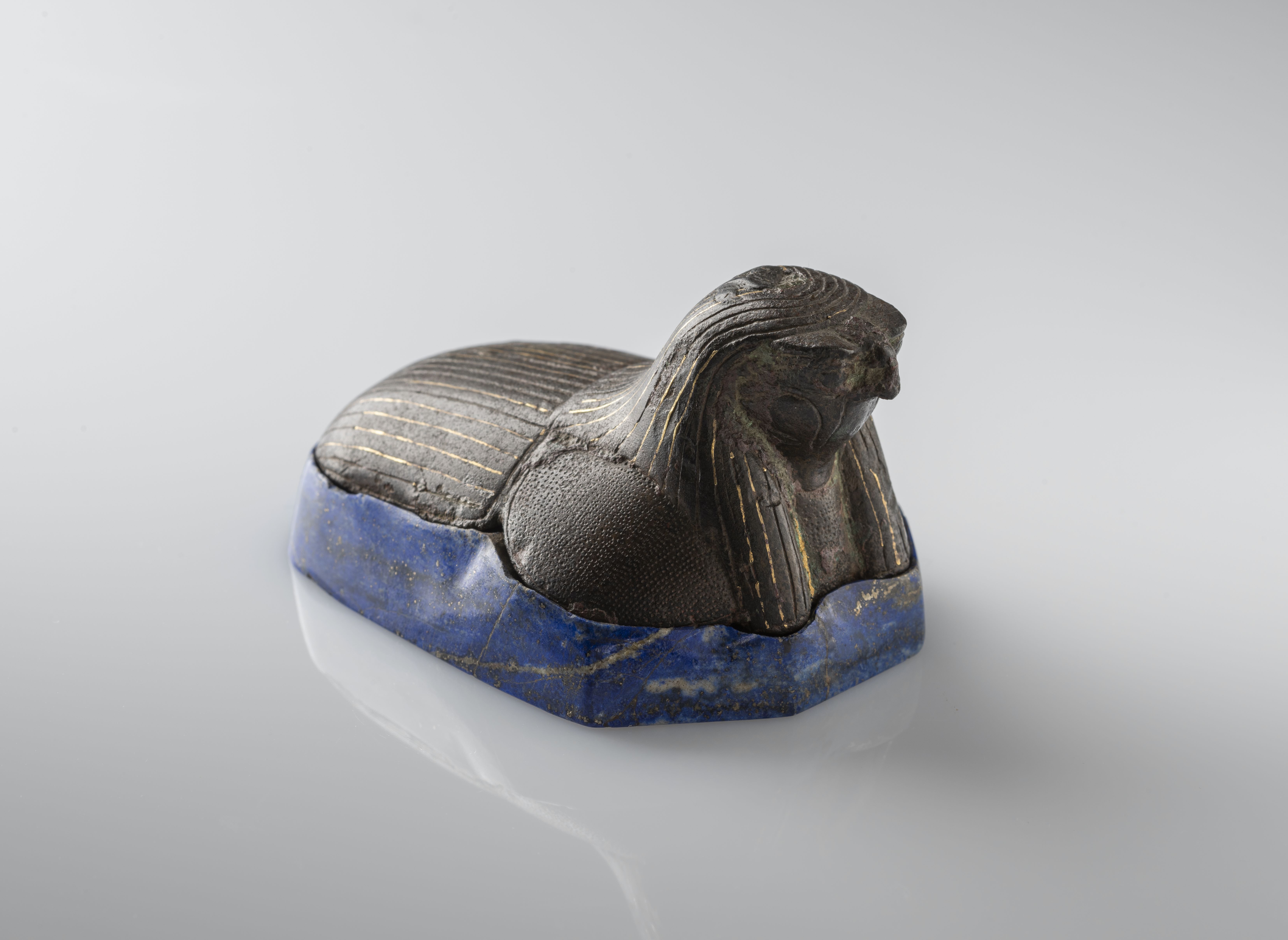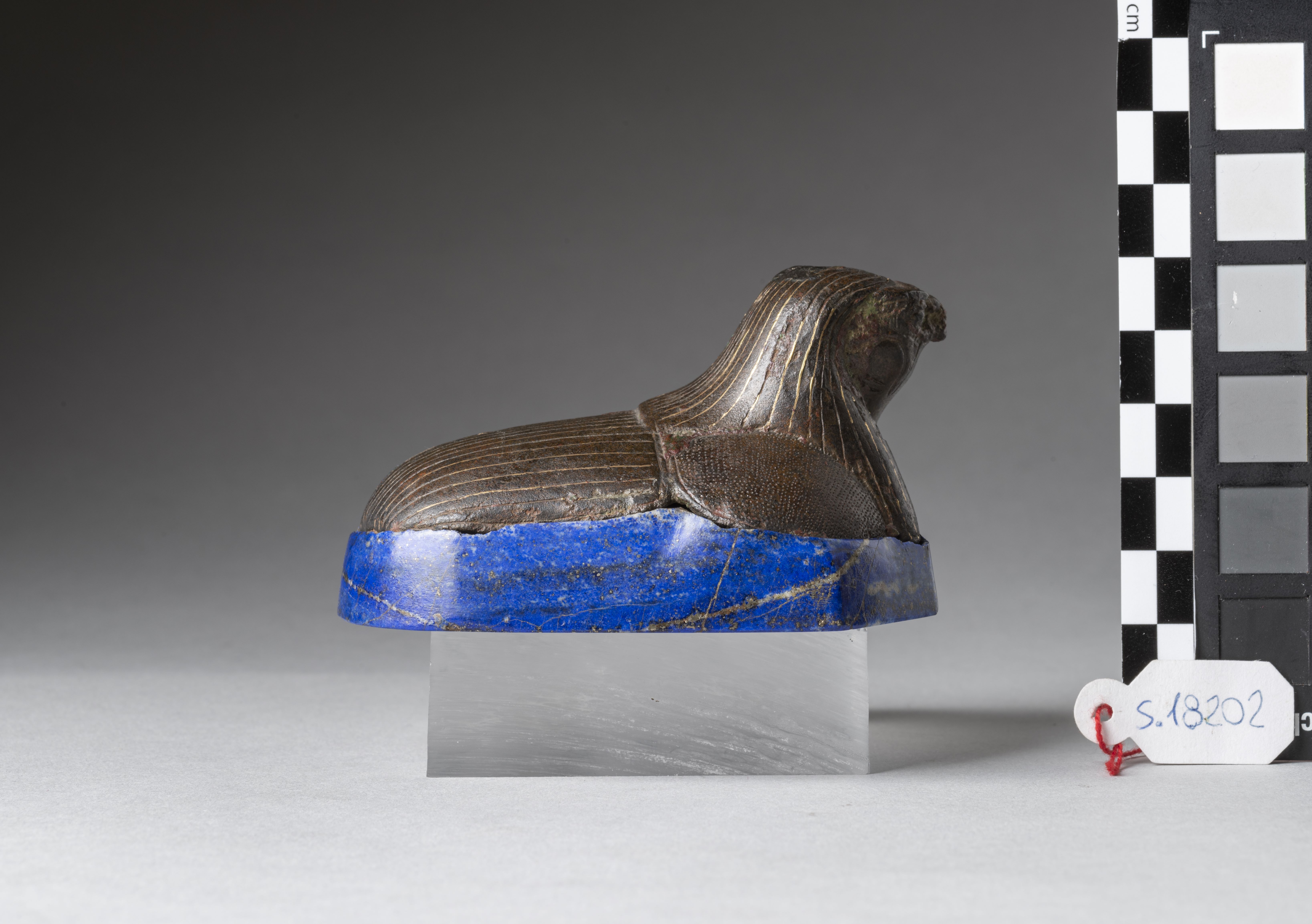 Scarabeo a testa di falco. La figura è finemente dettagliata. Il becco è piccolo e ricurvo, e sotto gli occhi le copritrici auricolari sono stilizzate come una forma ricurva con la punta rivolta verso il basso. La testa di falco porta una parrucca tripartita, con resti di intarsio in oro negli alloggiamenti verticali che la decorano. Le elitre sono decorate con linee verticali e presentano intarsi in oro parzialmente conservati. Il fondo reca uno strato di una sostanza non meglio identificata, forse dello stucco, con uno scasso rettangolare al centro, forse indicativo della posizione e della forma del tenone, ora mancante. Erano presenti sei zampe; la zampa mediana e quella posteriore destra sono mancanti. L’oggetto è poggiato su una base moderna in lapislazzuli. L'oggetto è realizzato con la tecnica della cera persa per la fusione piena.