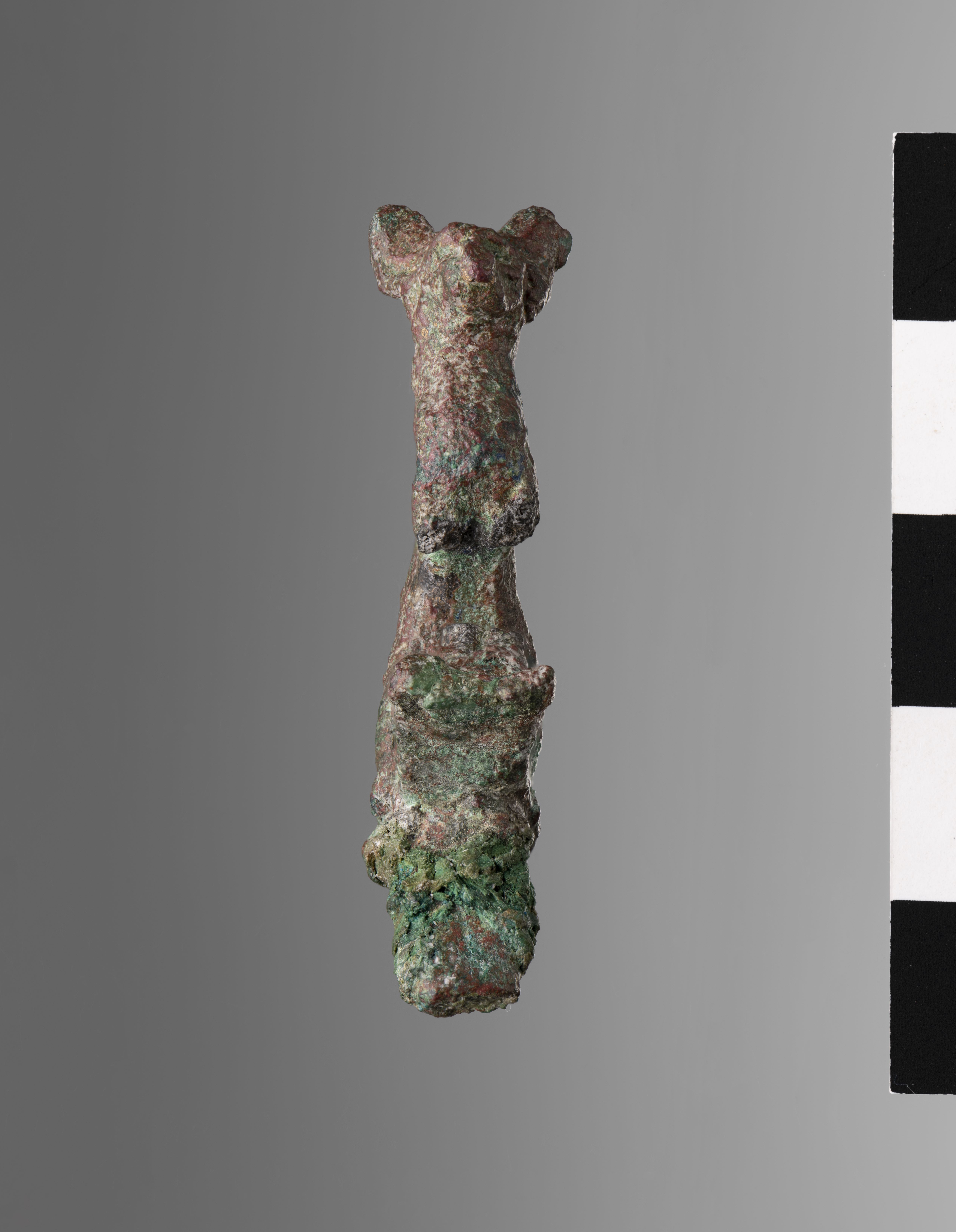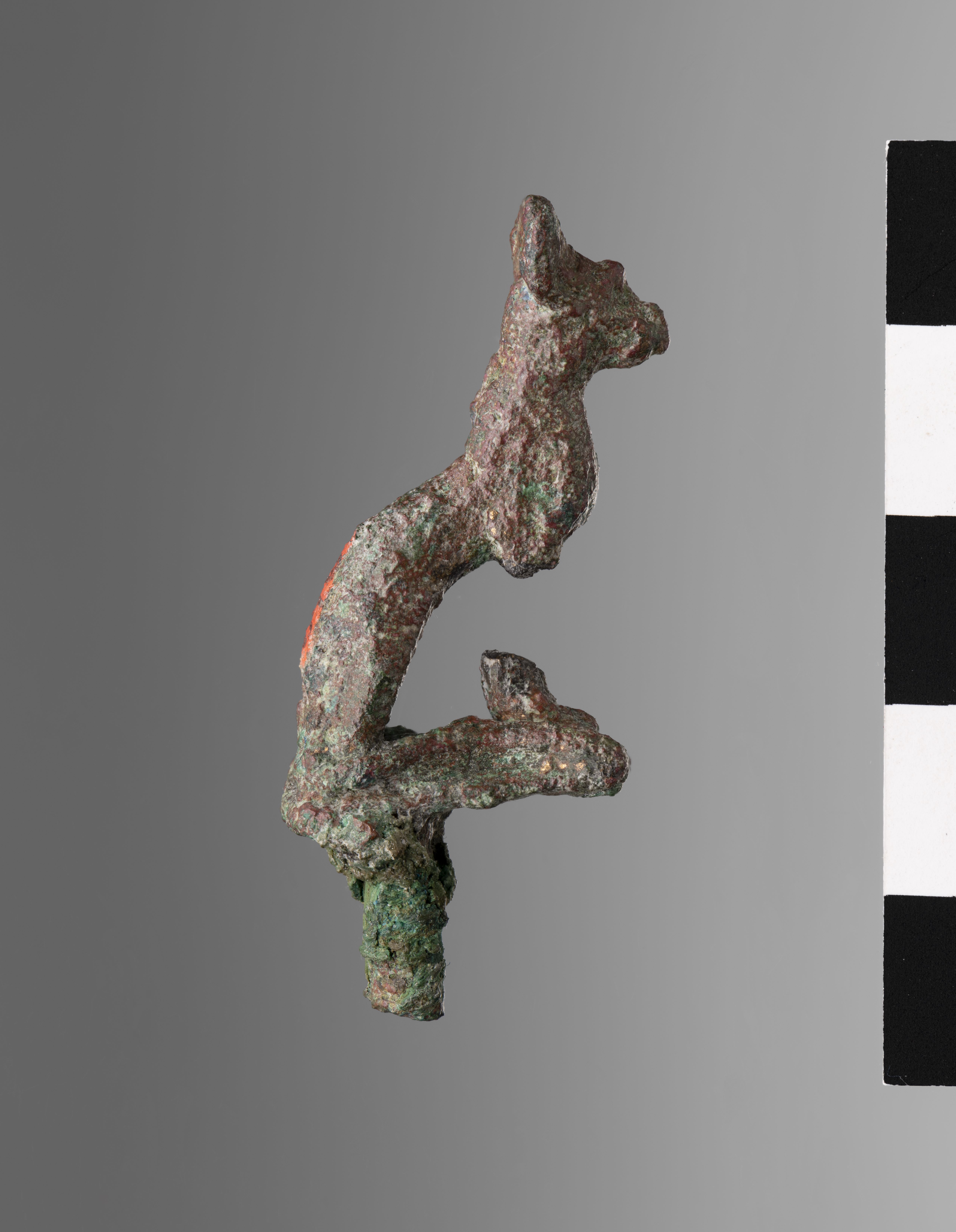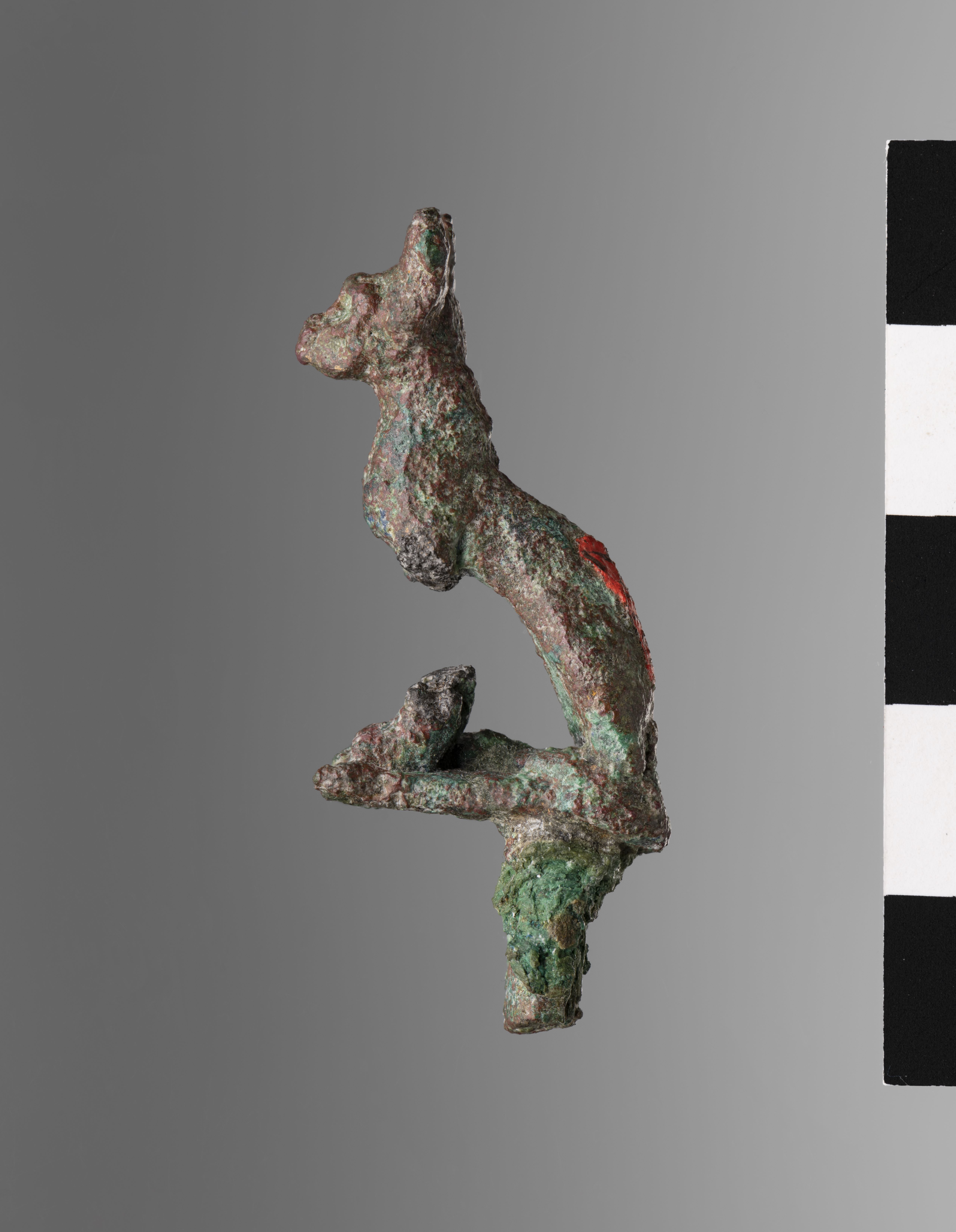 Figura di gatto seduto in posizione attenta con la coda lungo il lato destro. Le orecchie sono grandi e triangolari e rivolte in avanti. Il viso è stilizzato, si vedono gli occhi e il muso sporgente. Il collo è lungo, il dorso forma una curva accentuata. Le zampe anteriori sono rotte. Le zampe sono unite e la figura poggia su una base sagomata, forse in forma di segno sA (Gardiner V17), che indica la protezione. Da sotto la base sporge un tenone rettangolare. L'oggetto è realizzato con la tecnica della cera persa per la fusione piena.
